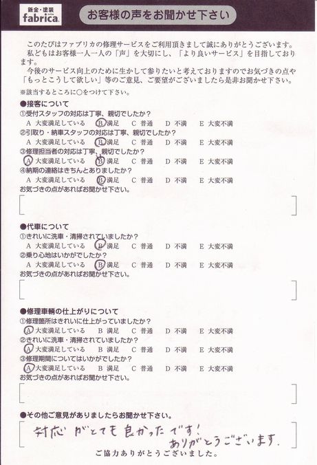 この度は数ある修理工場の中からファブリカをお選び頂き、誠にありがとうございました。また高いご評価と温かいお言葉ををいただきましたこと、重ねて御礼申し上げます。今後も何かお困りのことがございましたら、ぜひご用命くださいませ。