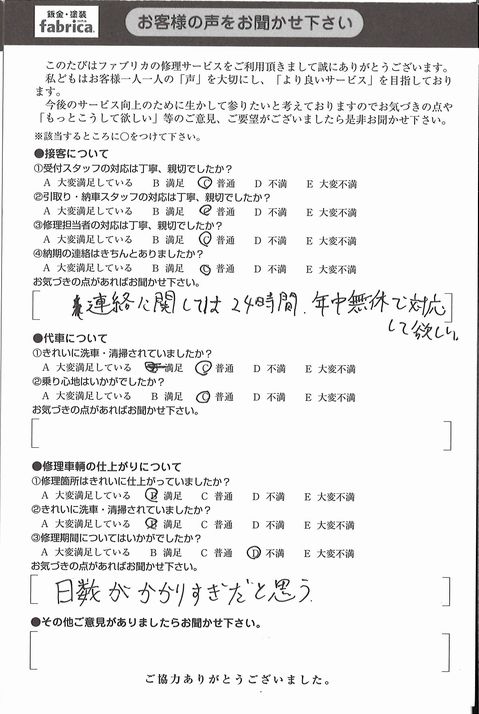 この度は数ある修理工場の中からファブリカをお選び頂き、誠にありがとうございました。納期につきましては、なるべく短縮できるよう努めておりますが、ご不便をおかけし誠に申し訳ございませんでした。今後も何かお困りのことがございましたら、ぜひご用命くださいませ。