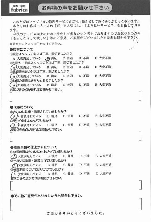 車に詳しくない私でしたが、自分で気づけなかった修理箇所を親切に教えていただきました。配車頂いた山口さんの対応は素晴らしかったです。ありがとうございました。