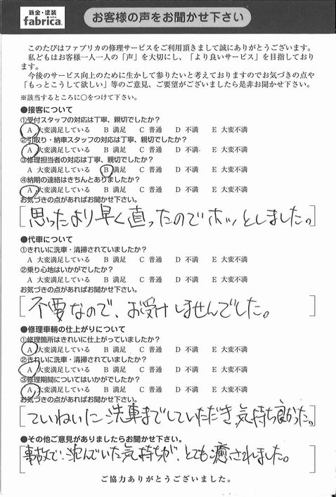 この度は数ある修理工場の中からファブリカをお選び頂き、誠にありがとうございました。この度は高いご評価とうれしいお言葉をいただきましたこと、重ねて御礼申し上げます。今後も何かお困りのことがございましたら、ぜひご用命くださいませ 。