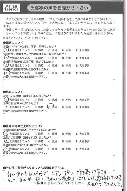 古い車にも関わらず、とても丁寧に修理をして下さり、そして車の外、内も綺麗に洗車して下さり、とても感謝しています。ありがとうございました。