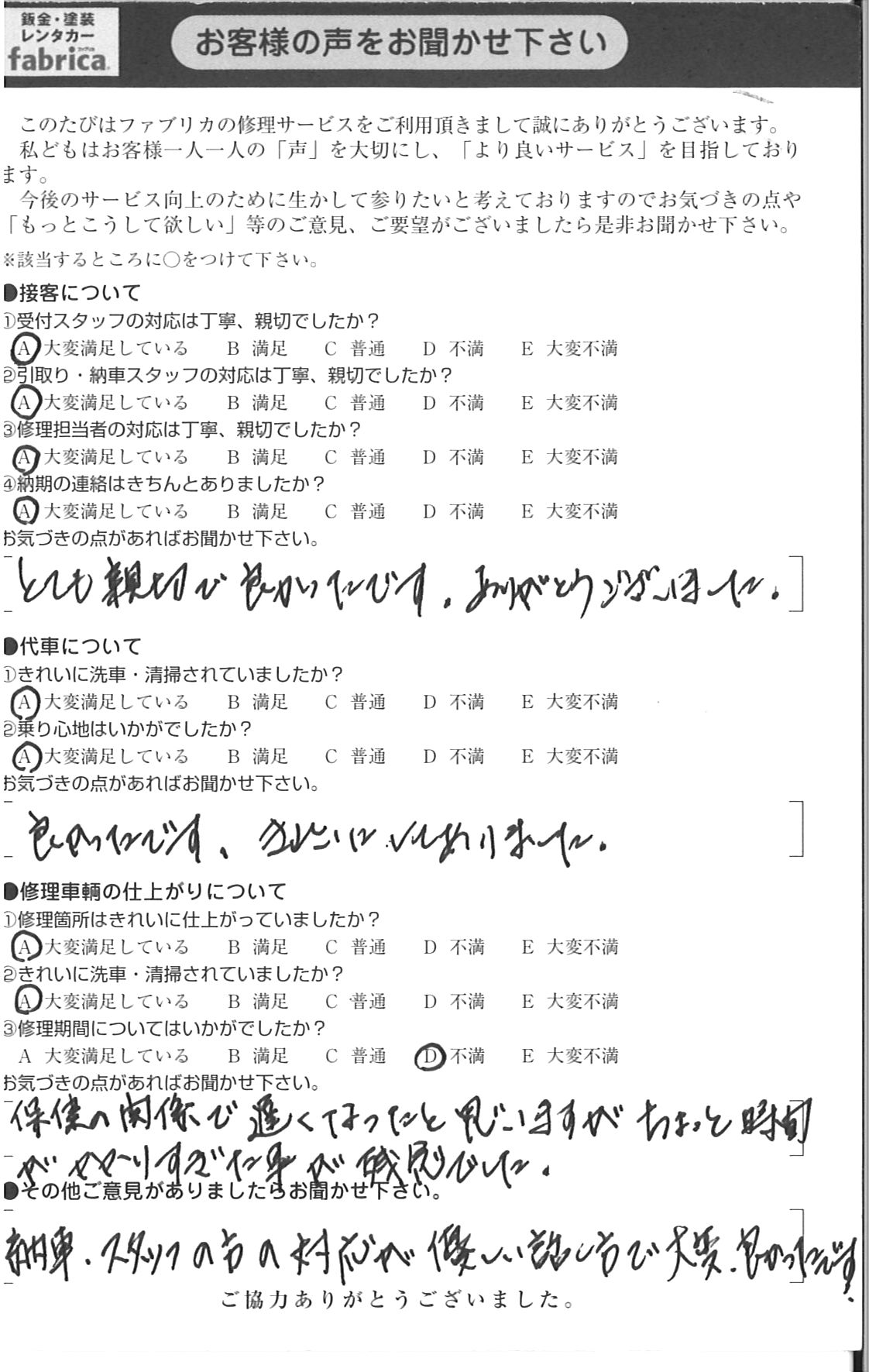 保険の関係で遅くなってしまったと思いますが、ちょっと時間がかかりすぎた事が残念でした。