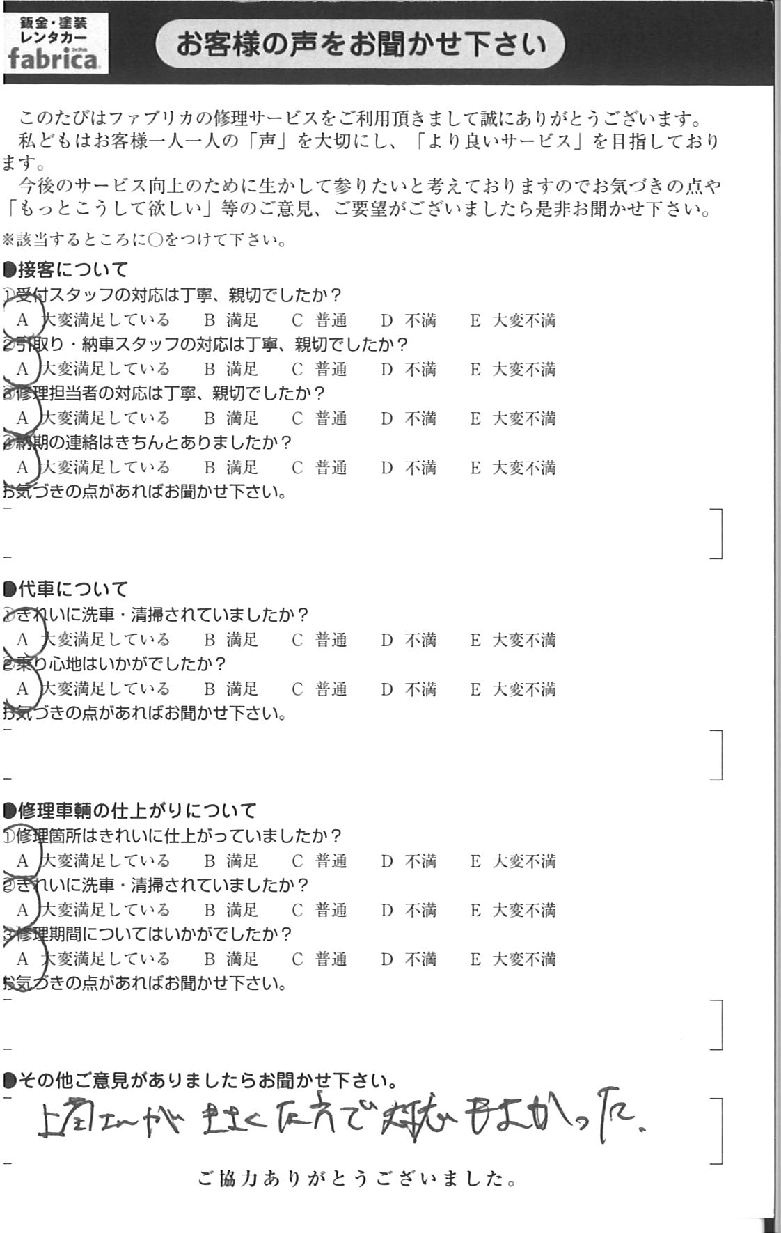 車に詳しくない私でしたが、自分で気づけなかった修理箇所を親切に教えていただきました。配車頂いた山口さんの対応は素晴らしかったです。ありがとうございました。