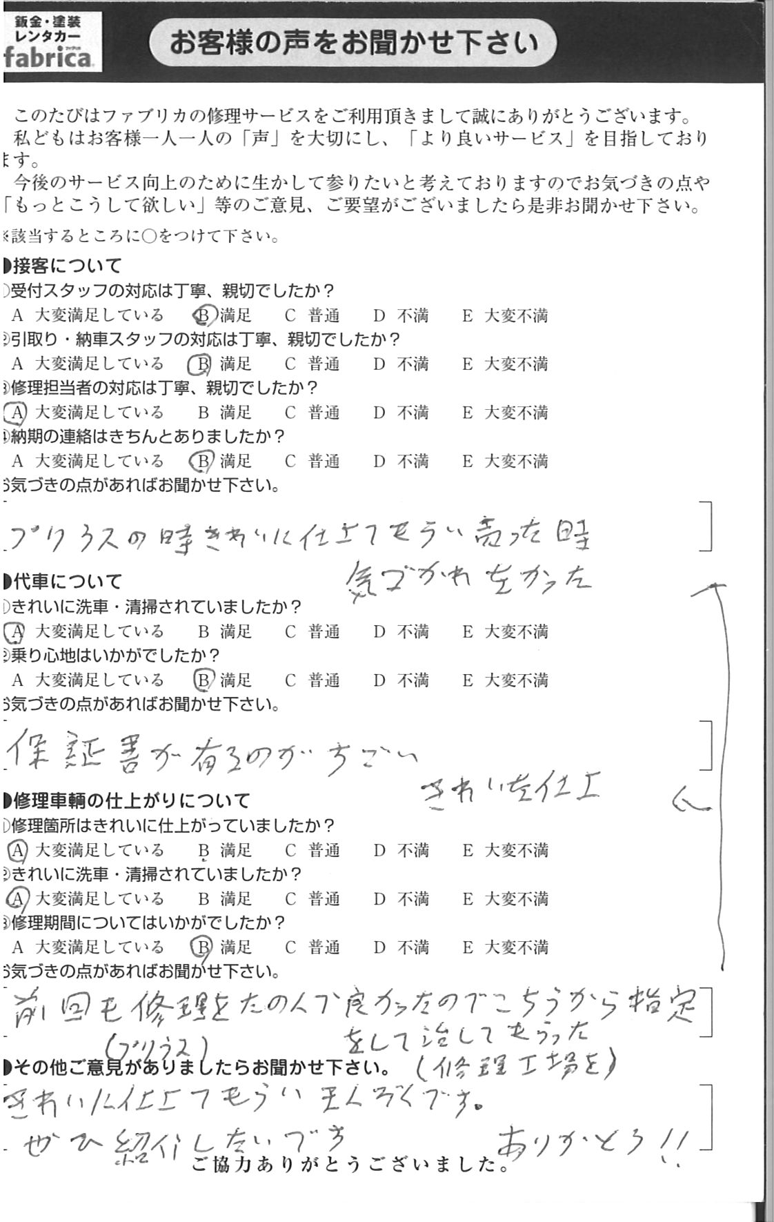 前回も修理を頼んでよかったので、こちらから修理工場を指定をして直してもらった→プリウスの時きれいに仕上げてもらい売った時気付かれなかった